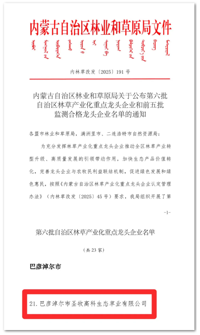 圣牧草业获评“内蒙古自治区林草产业化重点龙头企业”