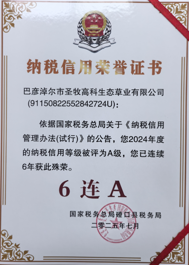 国家税务总局磴口县税务局开展的2024年度纳税信用等级评定工作中,巴彦淖尔市圣牧高科生态草业有限公司(以下简称“圣牧草业”)凭借多年来在诚信纳税、合规经营领域的卓越表现,再次被国家税务总局评定为纳税信用A级单位,被授予纳税信用“6连A”级单位。圣牧草业作为国家级农业产业化国家重点龙头企业和内蒙古自治区级农牧业产业化重点龙头企业,始终秉持“诚实守信、开拓创新、求真务实、责任担当”的企业核心价值观,将纳税信用视为企业重要的“无形资产”。这一荣誉不仅是税务部门对企业依法纳税的高度认可,更彰显了圣牧草业将诚信理念深植企业发展基因的坚定实践。